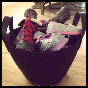 Our family shoes happily walk to this shoe bucket. We snagged this rugged number at the Container Store this summer. It is made out of recycled rubber. Nike rubber sole meet former rubber things made into a bucket bucket.