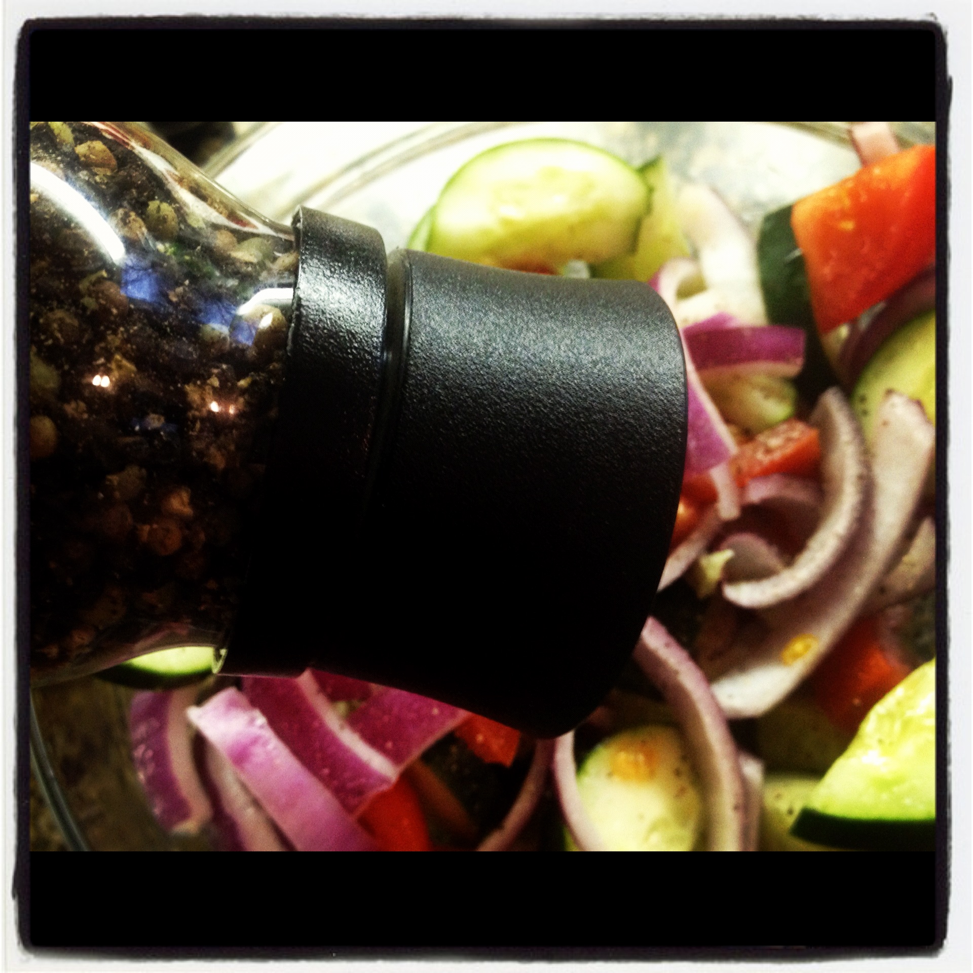 Stir in cucumber and onion.  Don’t touch the salad and then your eyes.  Just don’t.