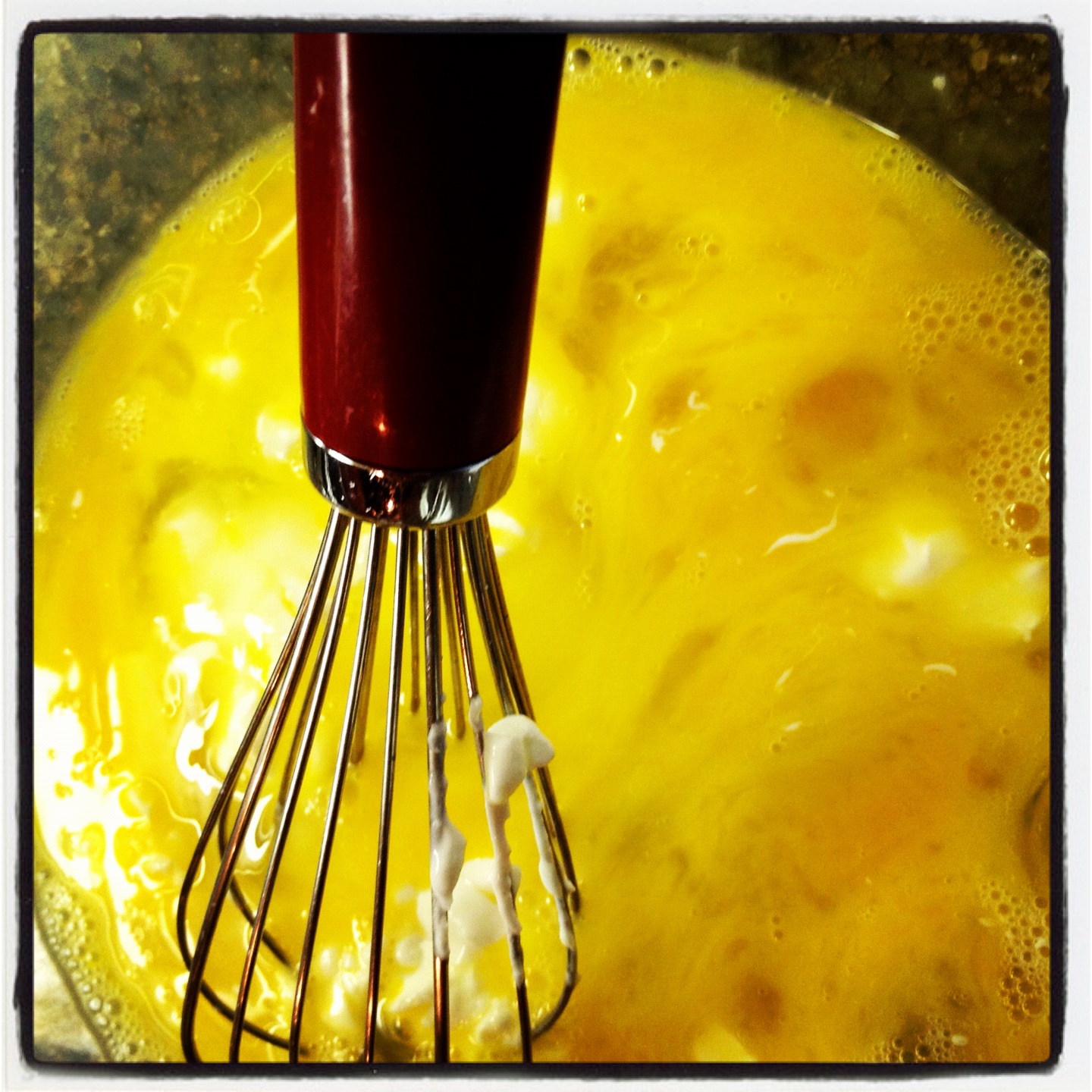 Meanwhile, in a medium bowl, whisk together eggs and sour cream and season with salt and pepper.