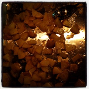 Welcome to Day 4 of my Everyday Food magazine’s ‘The $50 Week‘. Tonight’s dinner deliciousness? Vegetable frittata with roasted potatoes and garlic. Umm..yum! And if you’re wondering what in the world a frittata is you (and my son) can be rest assured that it is just a fancy word for egg dish. Since eggs are on Beaut.two’s unfortunately short list of things he’ll actually eat, I had my fingers crossed all the vegetables wouldn’t get in his way. Until of course I had to do some chopping. Then I uncrossed my fingers for safety reasons. And then promptly re-crossed them once the chopping danger passed.