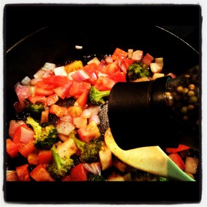 By this point, you may be saying to yourself, “It seems as though the green beans referenced above are missing.” And you, my very astute friend, would be correct! Blame it on winter, blame it on groceries traveling from far off places, blame it on my fridge, blame it on anything but the sad looking green beans that were supposed to be a part of this deliciousness. They had seen much better days and so I put them out of their misery and replaced them with an extra tomato. Tomatoes to the rescue!