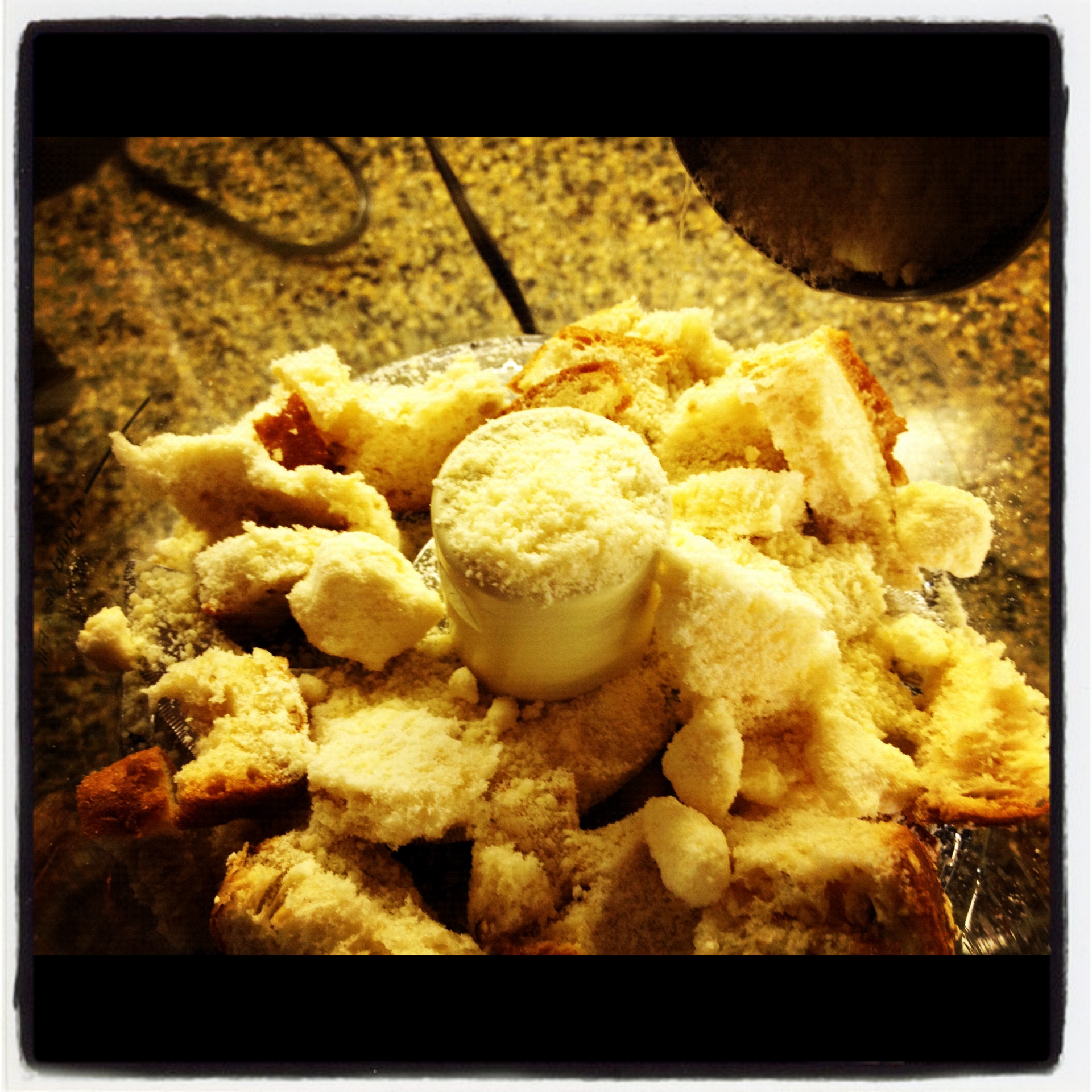 Process until fine crumbs form. (I used the Pulse feature on the processor so I could prevent the crumbs from turning into dust. That little appliance is powerful!)