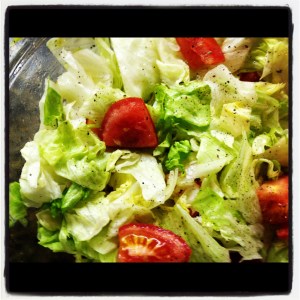 Add 3/4 head iceberg lettuce, chopped, and 1 tomato, cut into wedges. Toss to combine.