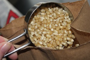 Measure 1/2 cup of that popcorn gold and pour into a paper bag. A simple, paper lunch bag will do.