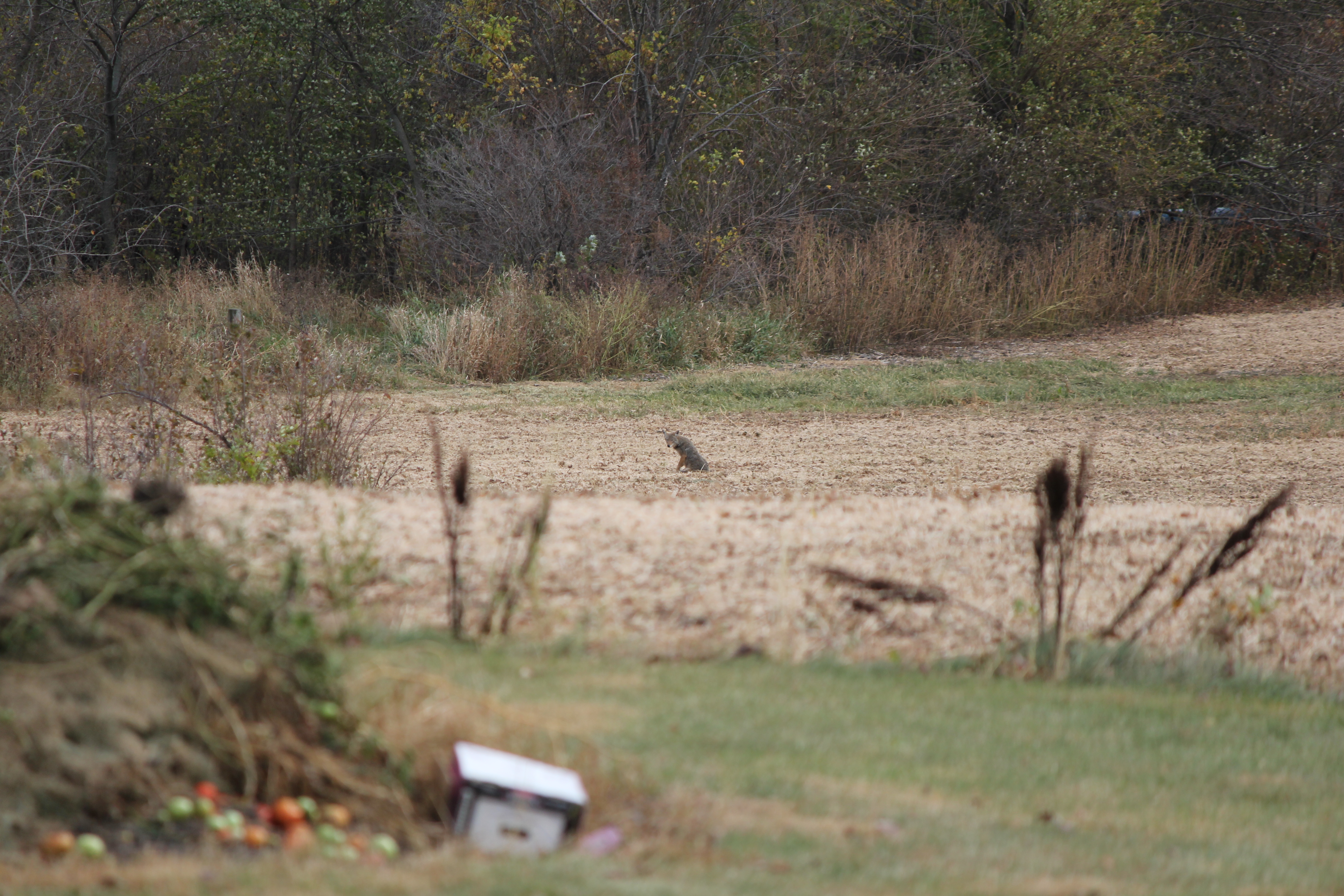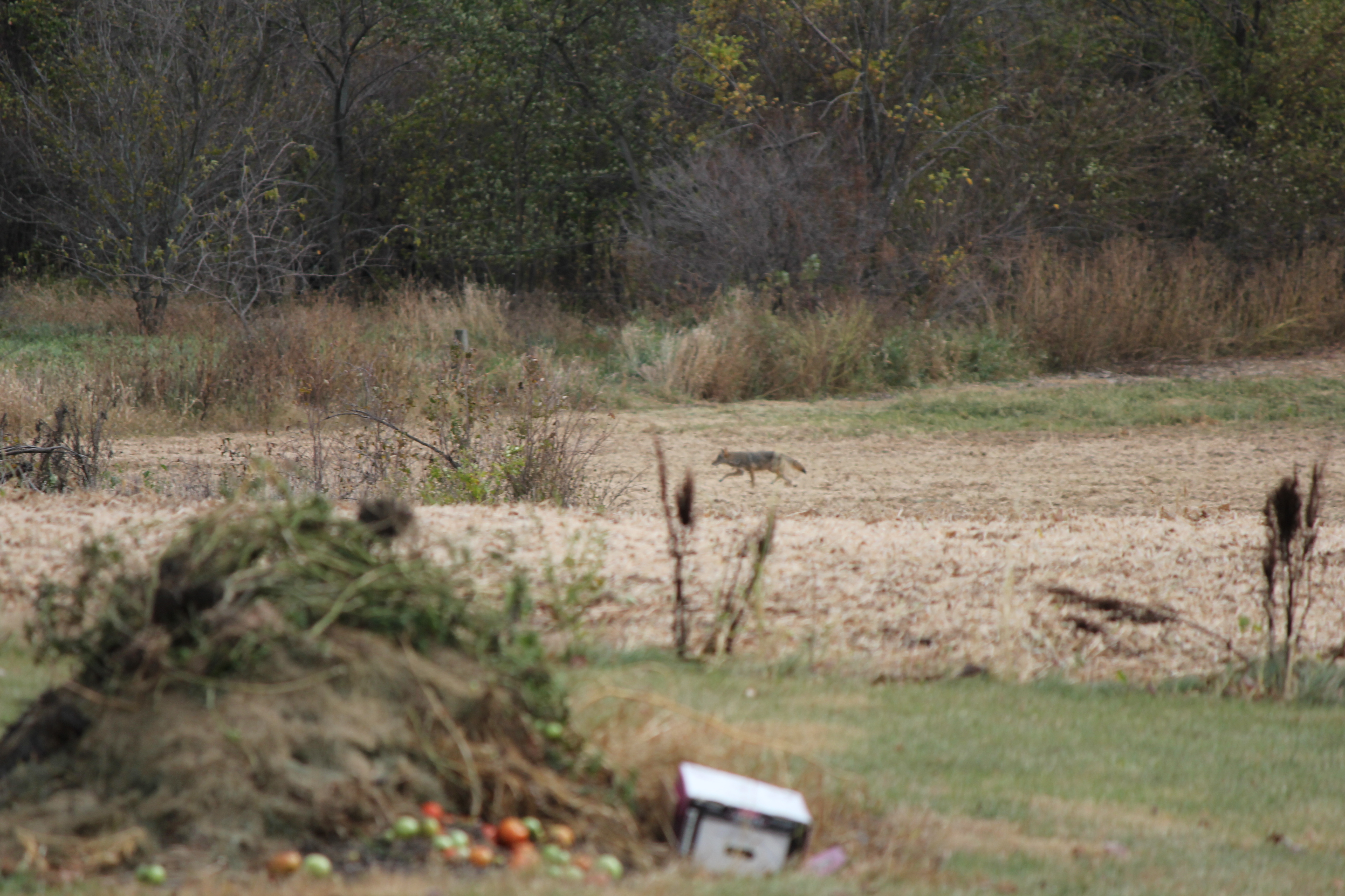 And then there are the coyotes. Yes, that’s right. Coyotes. Up until this moment I had only occasionally heard them howl at night. But never had I seen one. In the foreground of the photo you can see our burn pile and the end of our backyard. He looks far away but he really isn’t at all. We didn’t have our telephoto lens on (too freaked out to move) and this is shot from inside the safety of our home. The wild beast was taking a moments rest in the field directly behind our backyard. Directly behind where my beauties play on their swing set and chase each other.