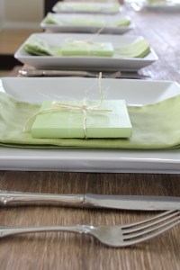Oh, Martha Stewart craft paint.  How I love thee.  So versatile, so reliable and so very, very pretty.  She seriously has the most beautiful color palette.  I’d like to introduce you to the colors Scallion (32010) and Artichoke (32011).  They made fast friends with my new napkins.