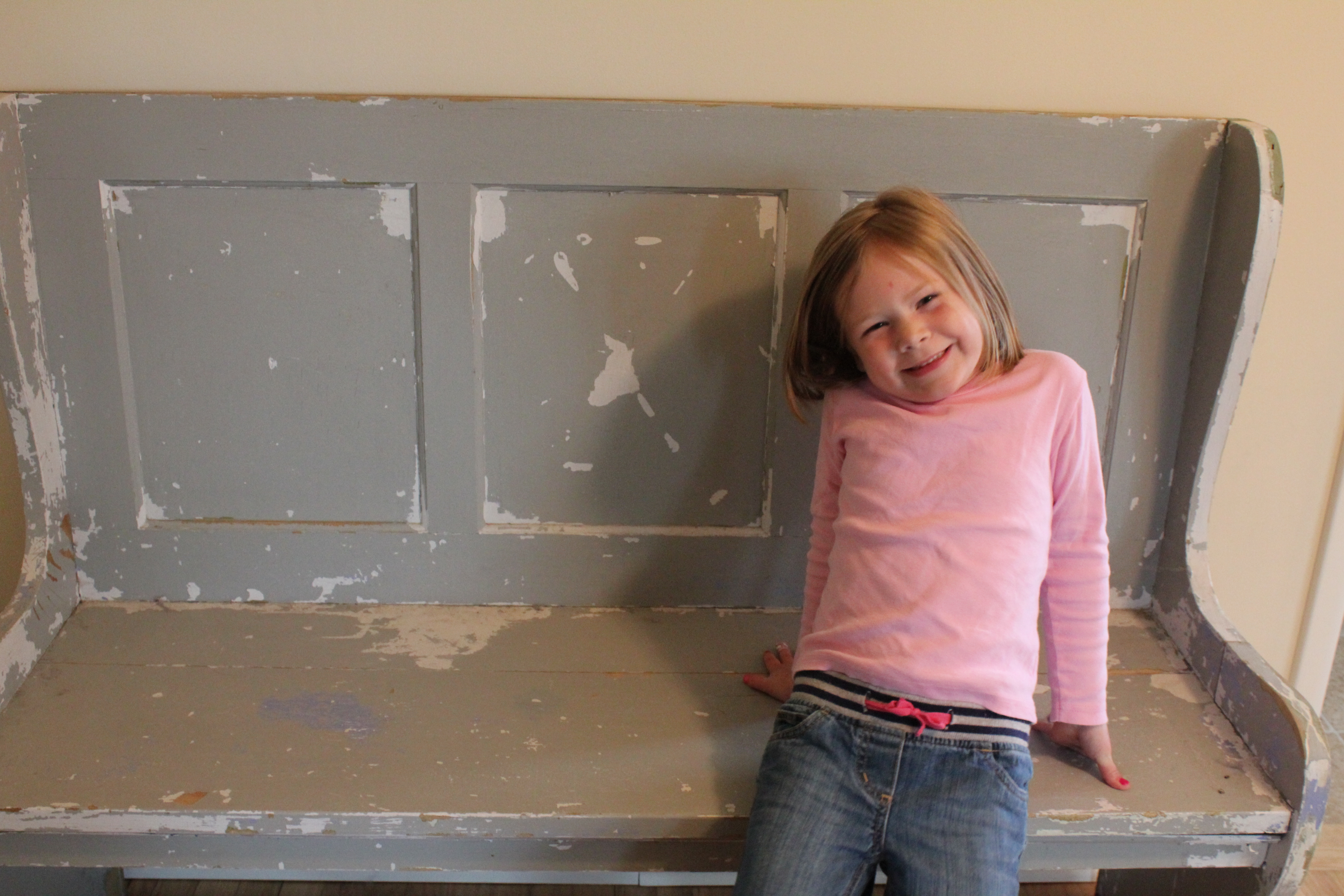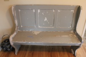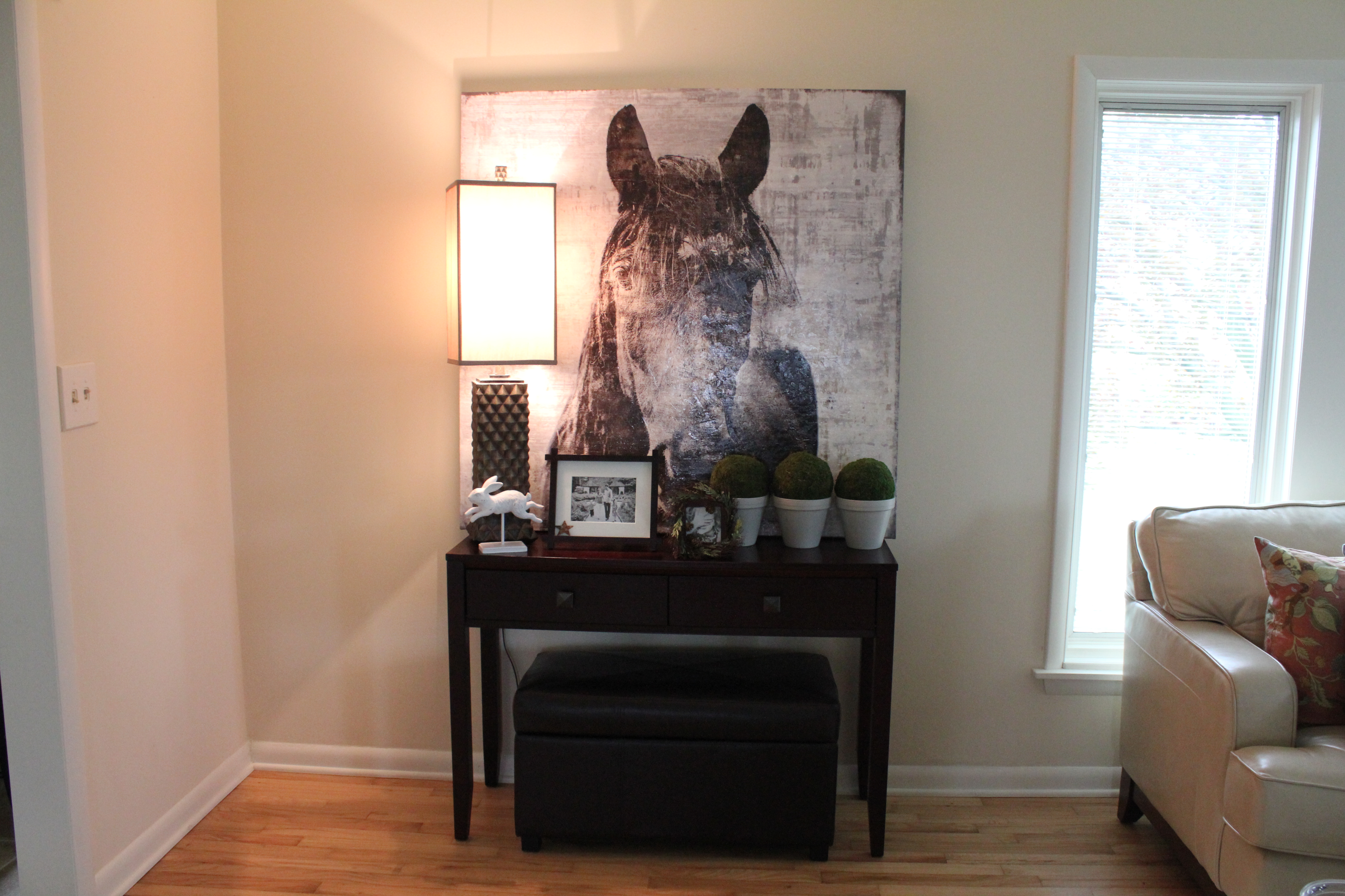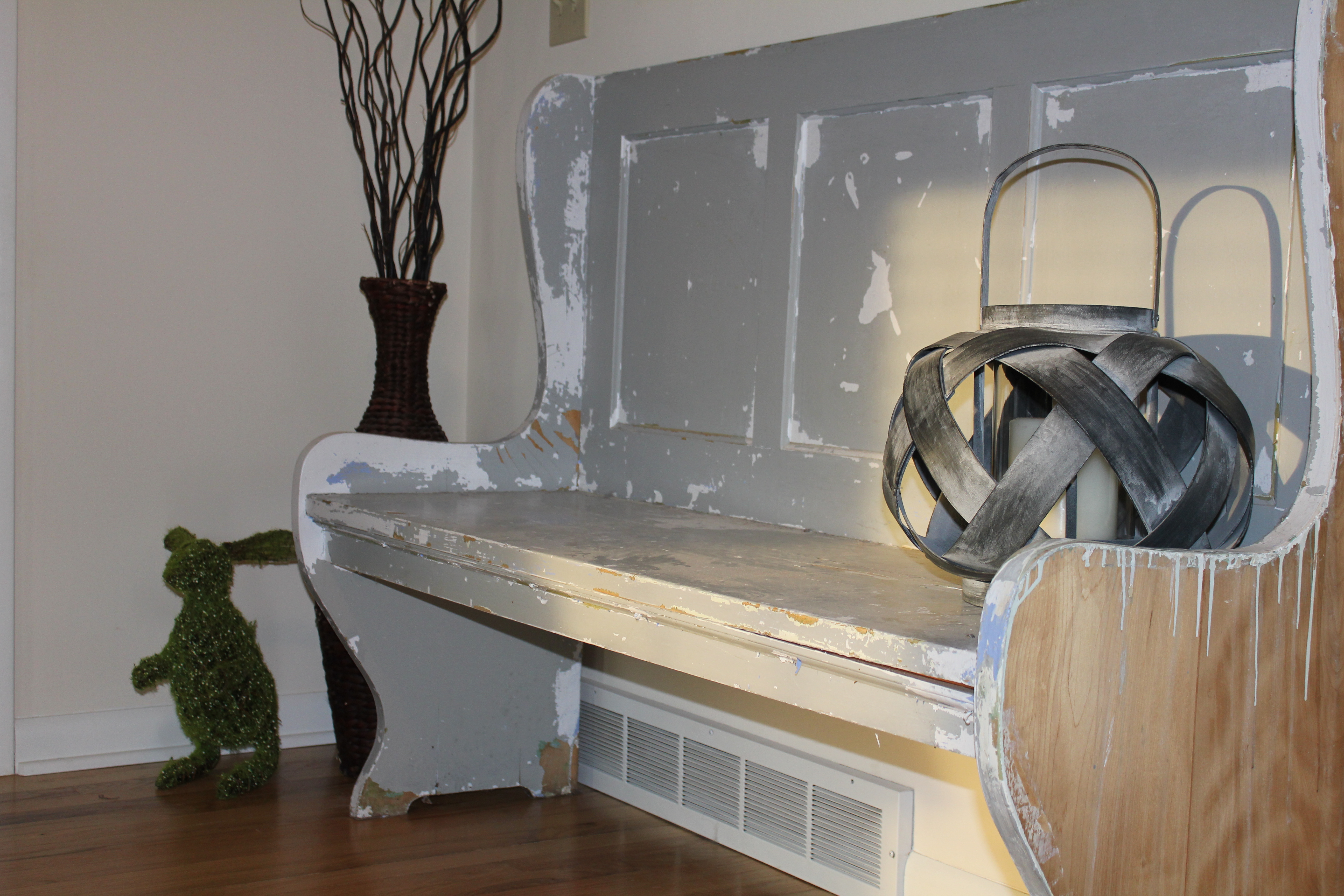 The counsel table, horse art, lamp, storage bench and all other manor of pretty were moved from this living room wall.  And replaced with an old church pew.