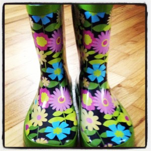 To my credit, two pairs of the shoes were more necessity than splurge. My lovely daughter needed a new pair of rain boots since her sweet Hello Kitty ones just stopped fitting last week. And rain boots get a workout around here. They are essential footwear for fishing and earthworm hunting, garden and burn pile monitoring. Oh, and yes, they are also worn for puddle stomping after a good rain.