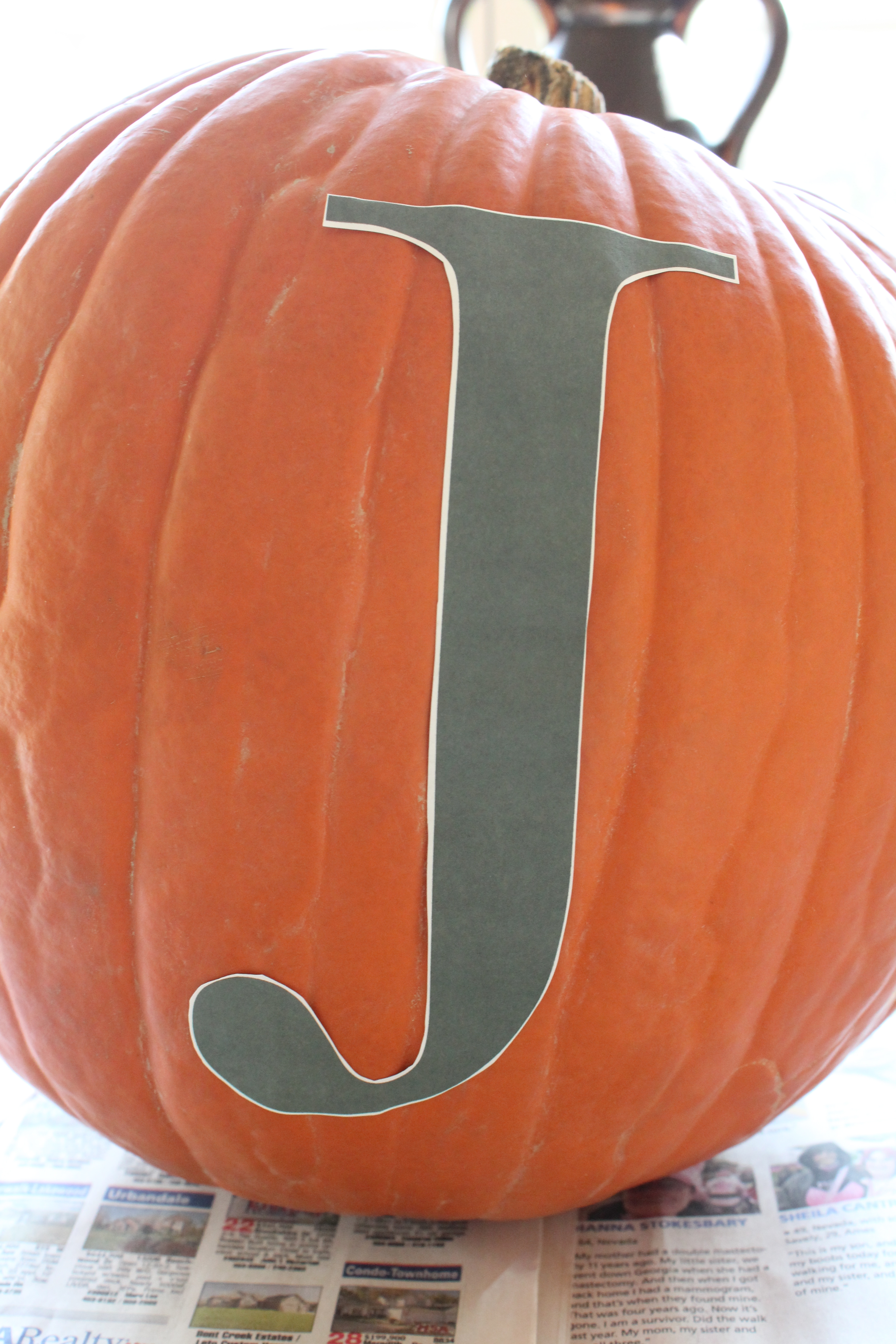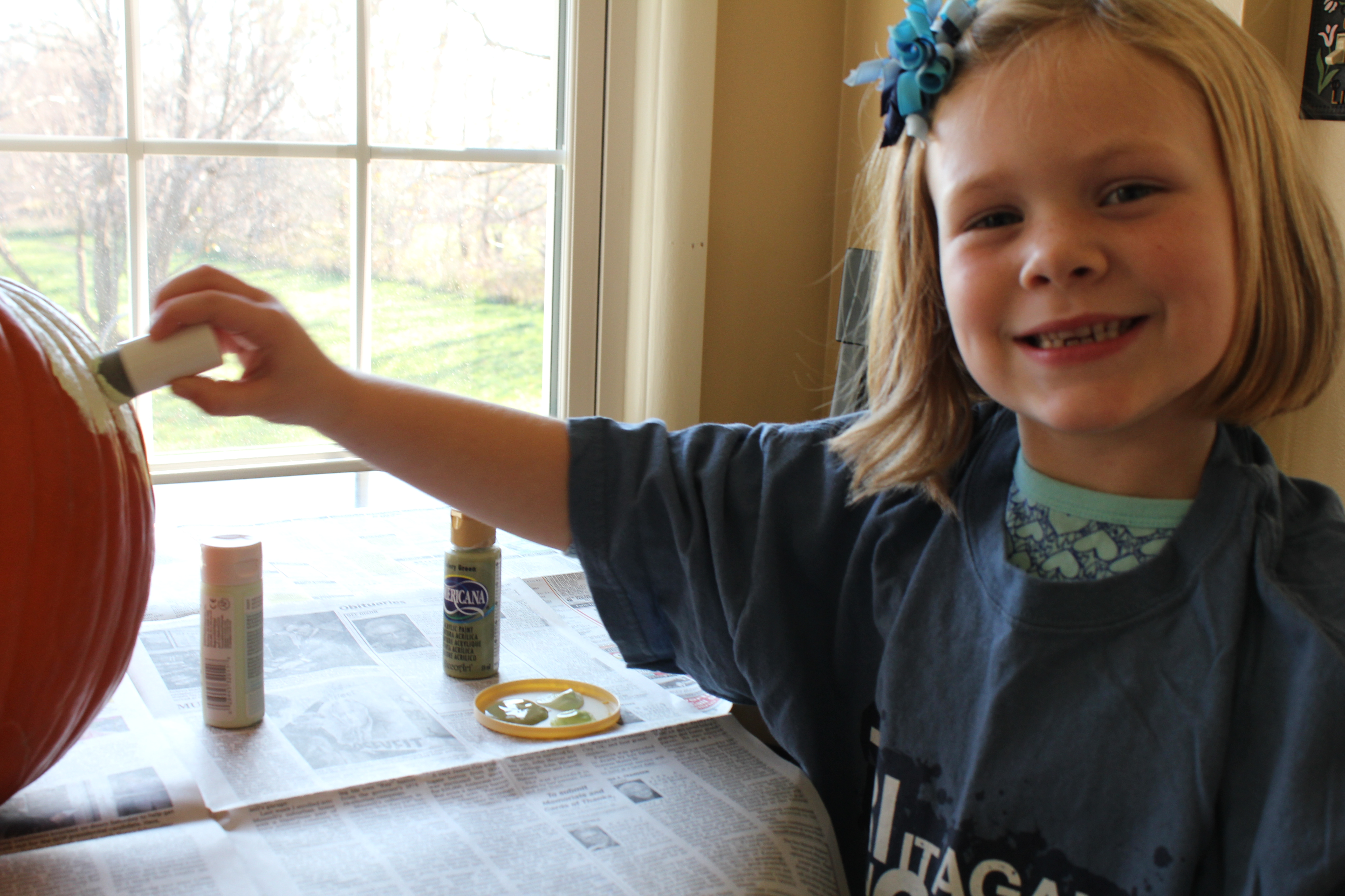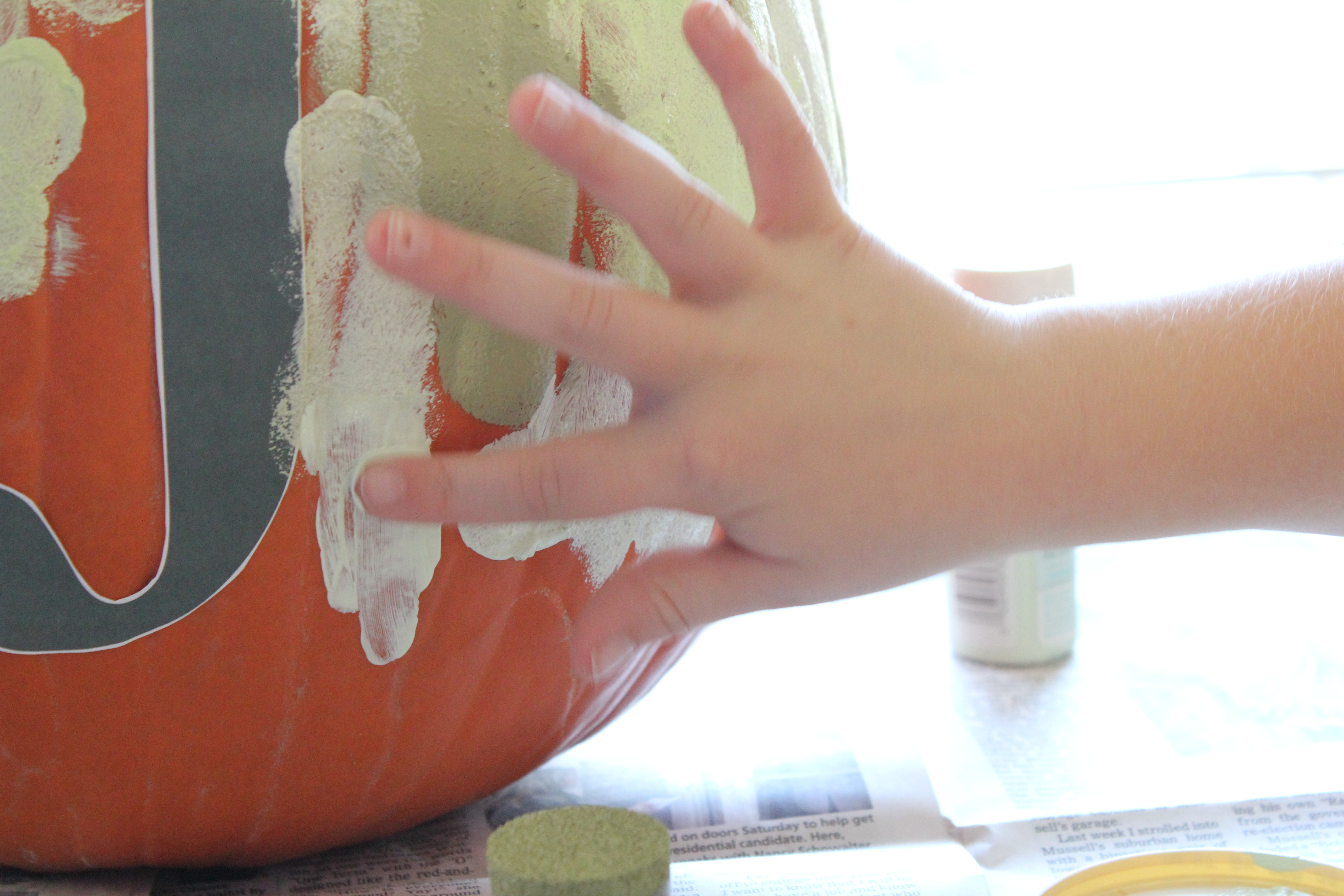 Then I sized and printed out our initial. I affixed it to the pumpkin with double-sided tape so it would stay in place while little fingers, hands and brushes went about the business of transforming this orange old boy into green gorgeousness.