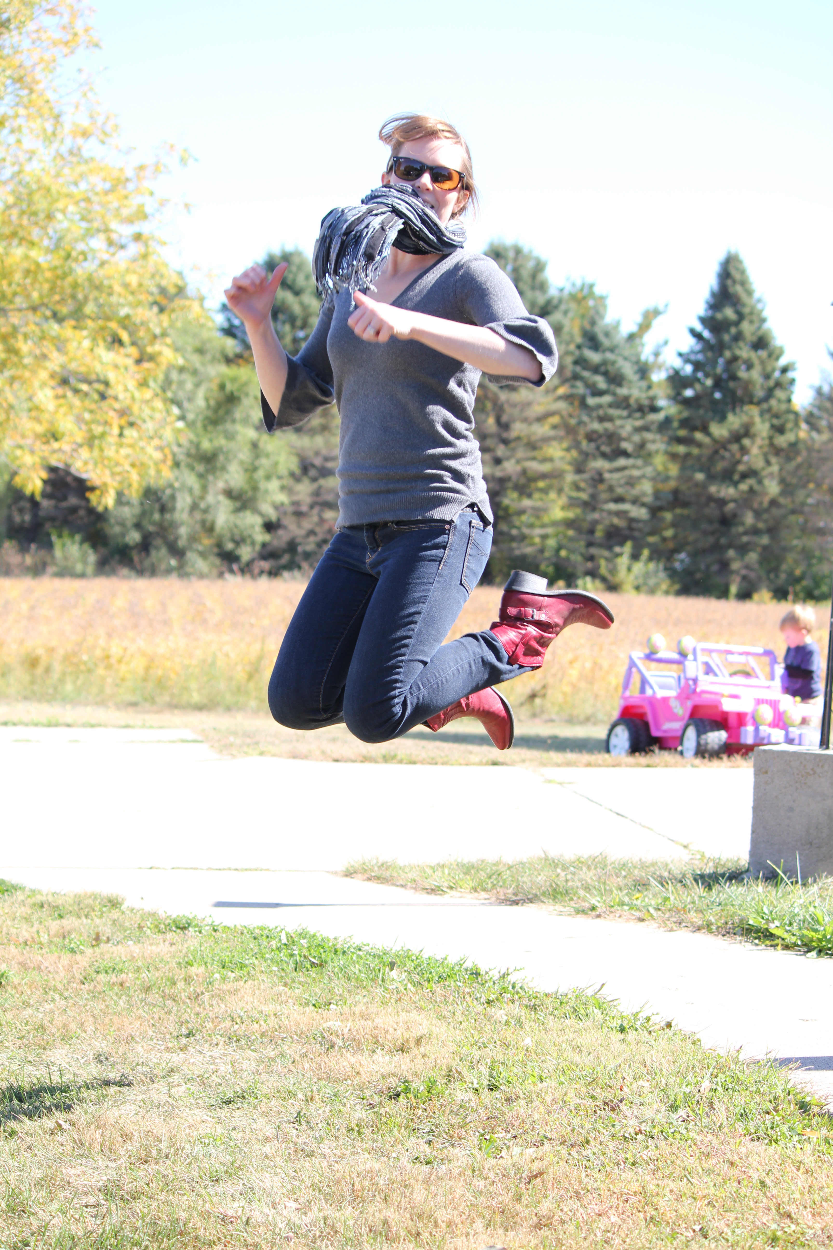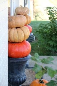 And the best part? This freeze-proof loveliness is so simple to pull off! All you have to do is purchase pumpkins in three different circumferences and, if necessary, saw off the stems from the bottom two layers. Then use your raw, brute strength to hoist the ‘kins on top of your pots or urns. Voila! Front porch gorgeousness. If available, you can also add your red-headed son to the display.