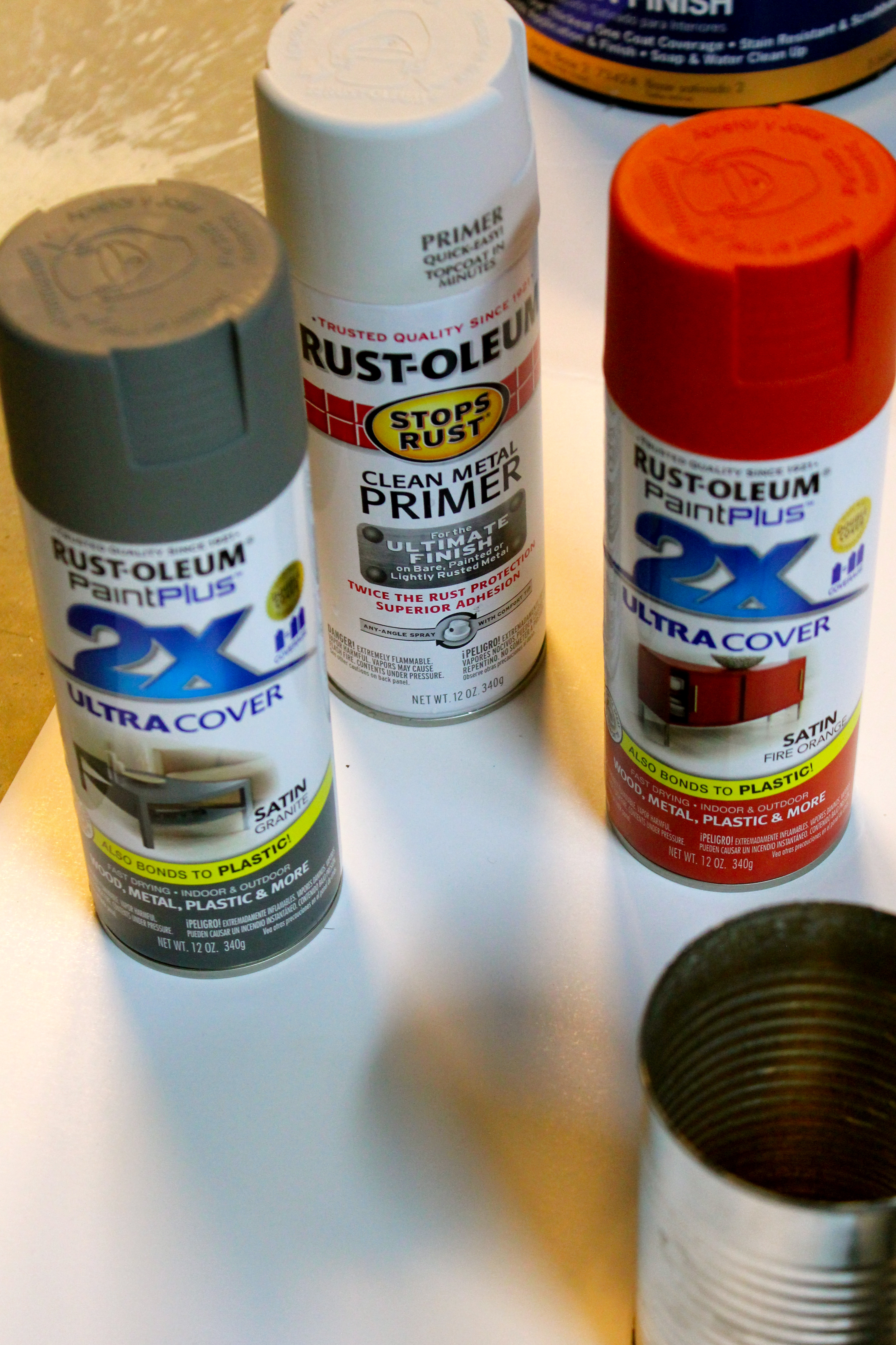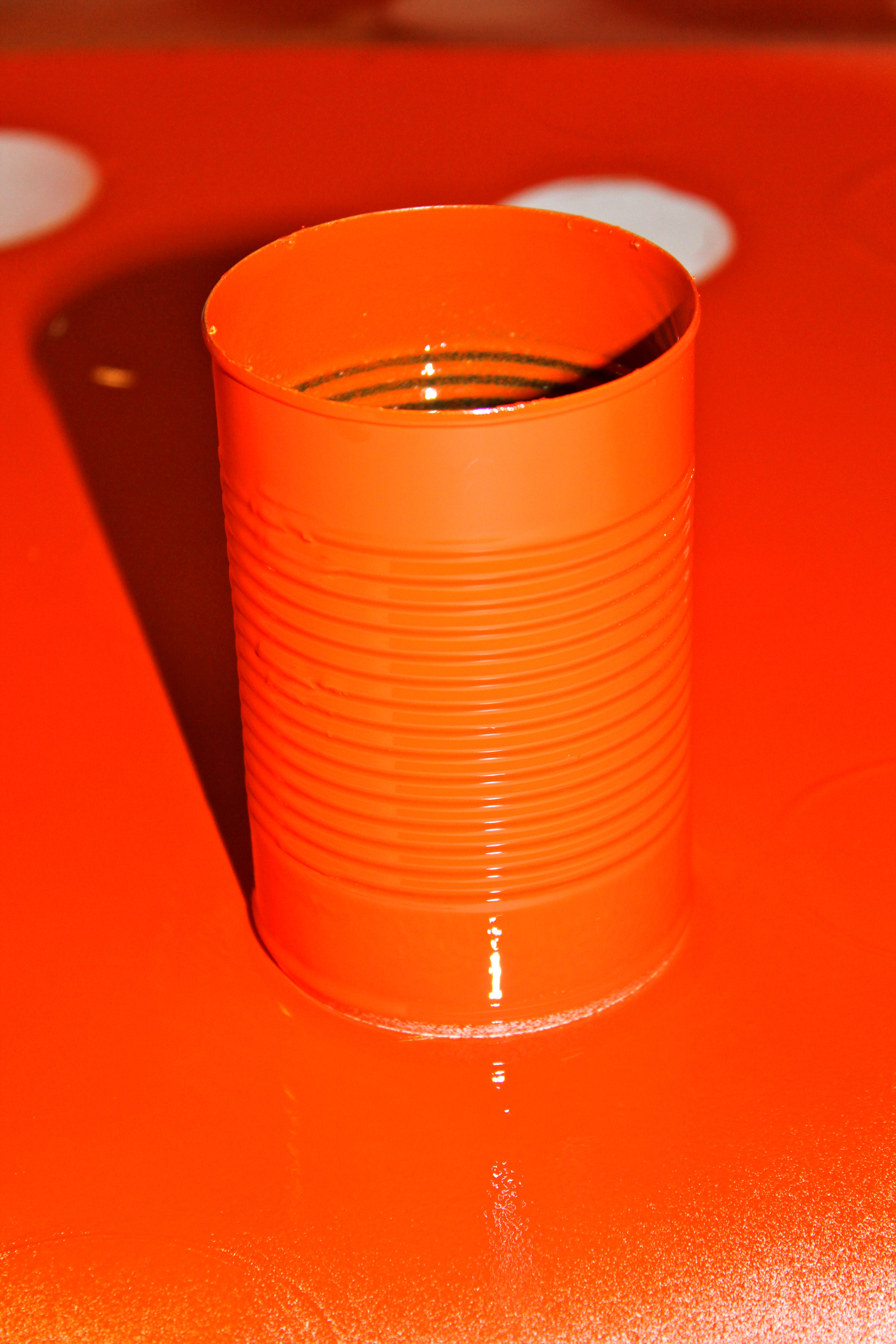 Then I used Rust-Oleum spray paint in Fire Orange on half the cans.