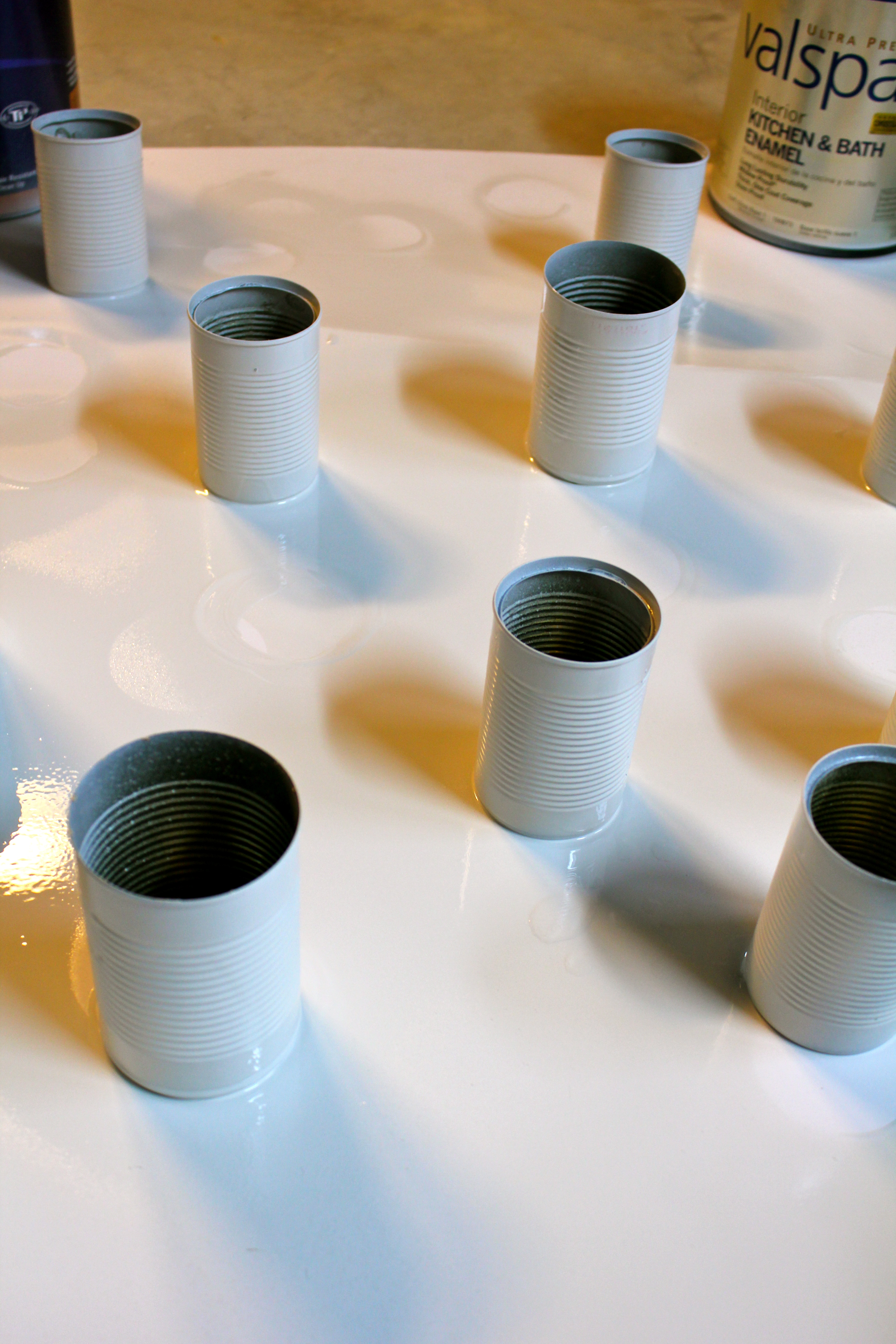 After eating the contents (I fear I will NEVER be able to look at mandarin oranges the same ever again.), I washed and dried the cans. I then primed and spray painted all ten of these babies.