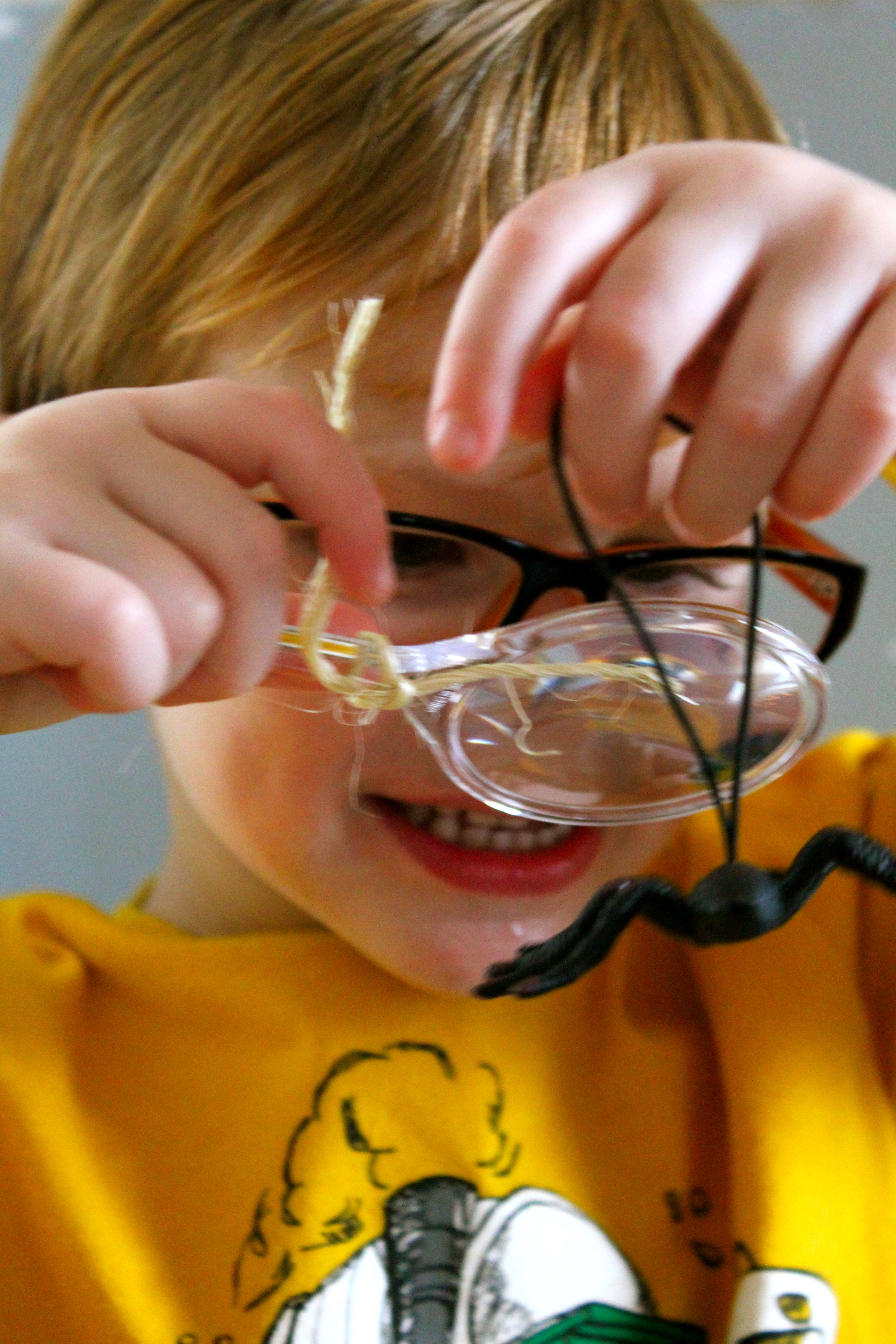 We placed the…um…specimens in these clear, plastic viewing containers. The tops of the containers contained a magnifying glass so the kids could see the bugs up close and personal. (Containers were also purchased from Oriental Trading.)