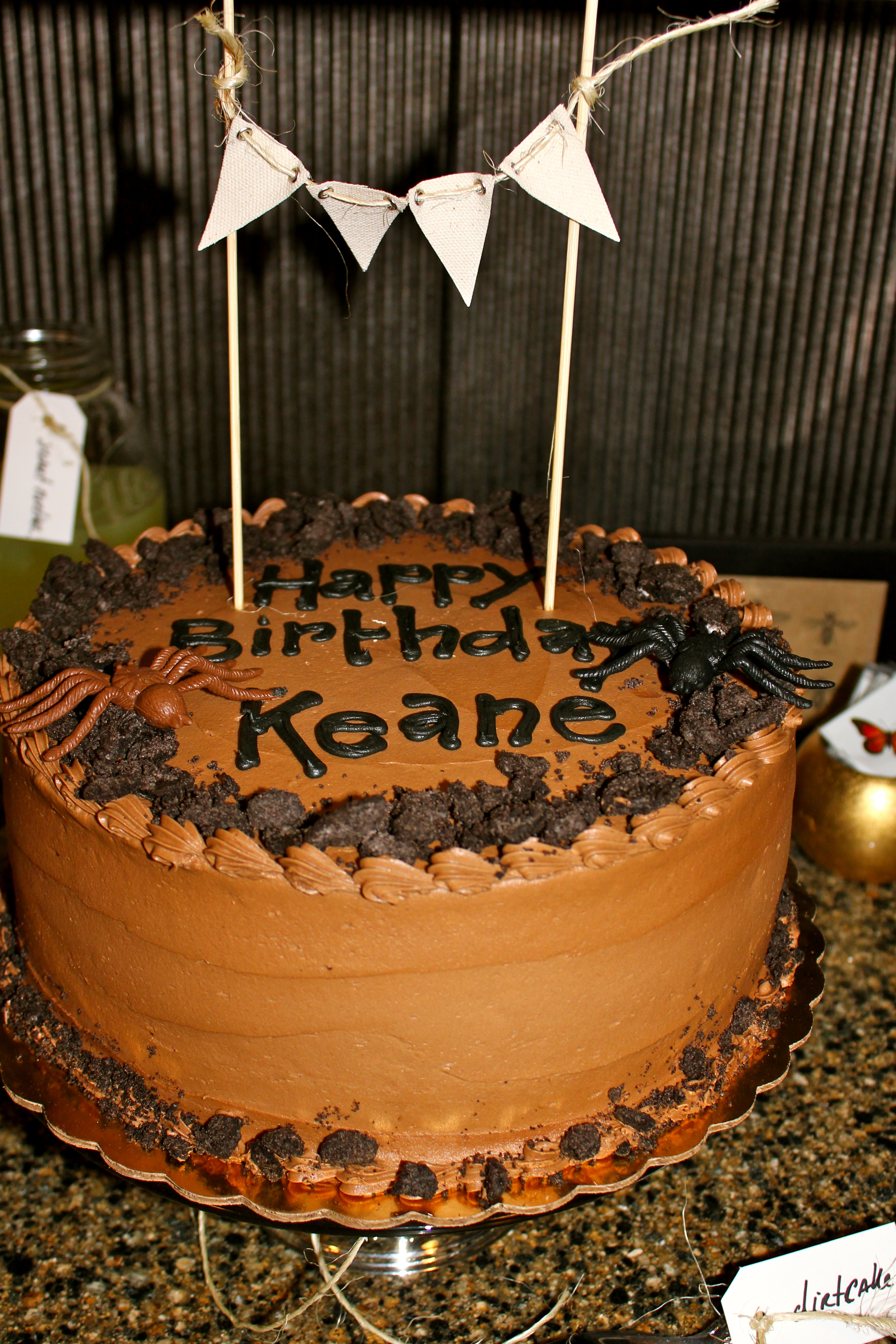 We had a ‘dirt’ birthday cake for this outdoor-inspired affair. A chocolate cake topped with piles of dirt (Oreo cookies) and some (thankfully) fake spiders was blissfully delicious.