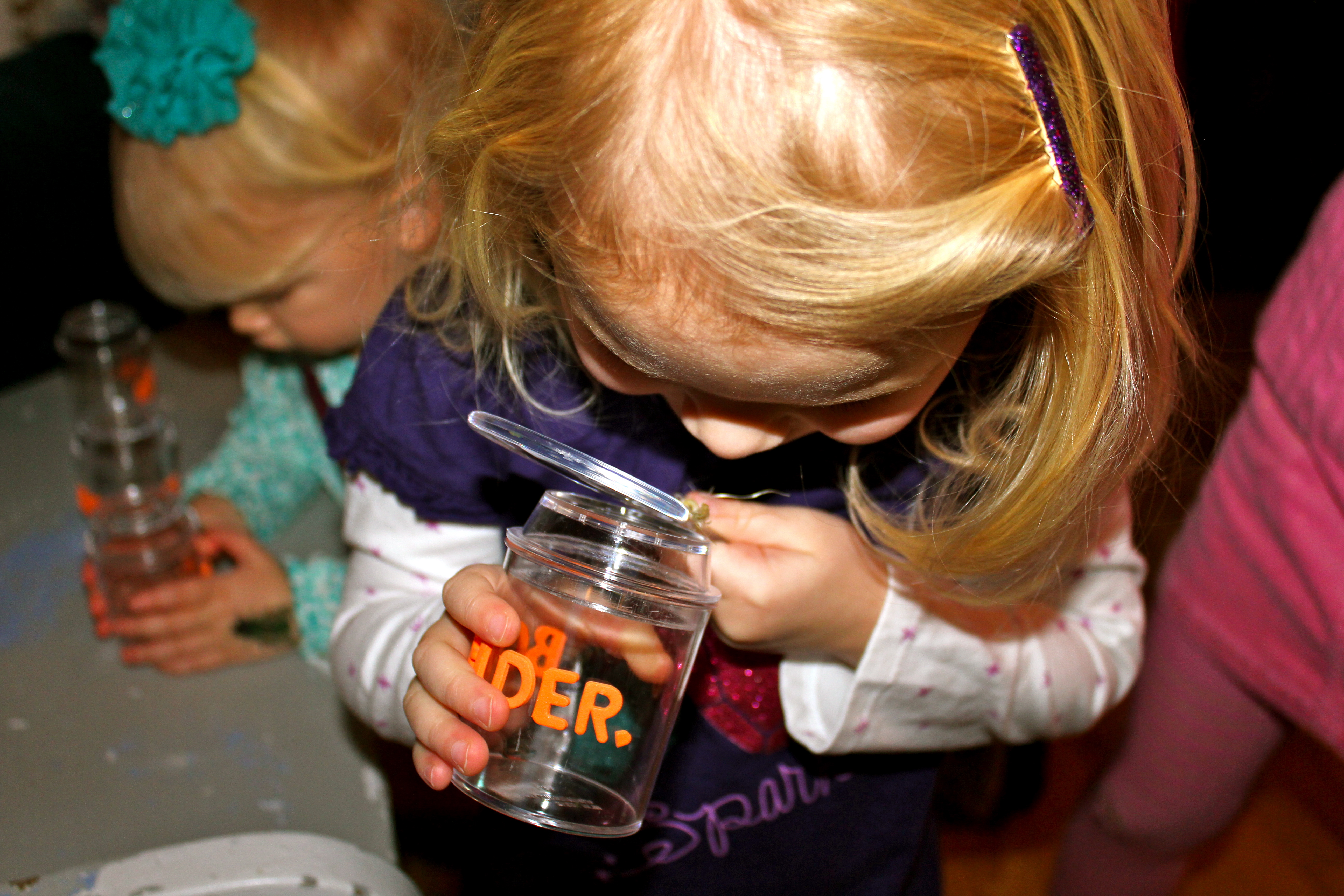 We had spiders and beetles and crickets…oh my! A majority of the bugs were procured from our local pet store and at least one (Mr. Spider) from our basement…yikes!!! The bugs from our pet store ended up being free too when my husband happened to mention that we just needed one of each for our party. They sell things like crickets in bulk so reptiles of all stripes get their supper and I am quite sure they did not have a way to ring up one solo cricket. So free it was!